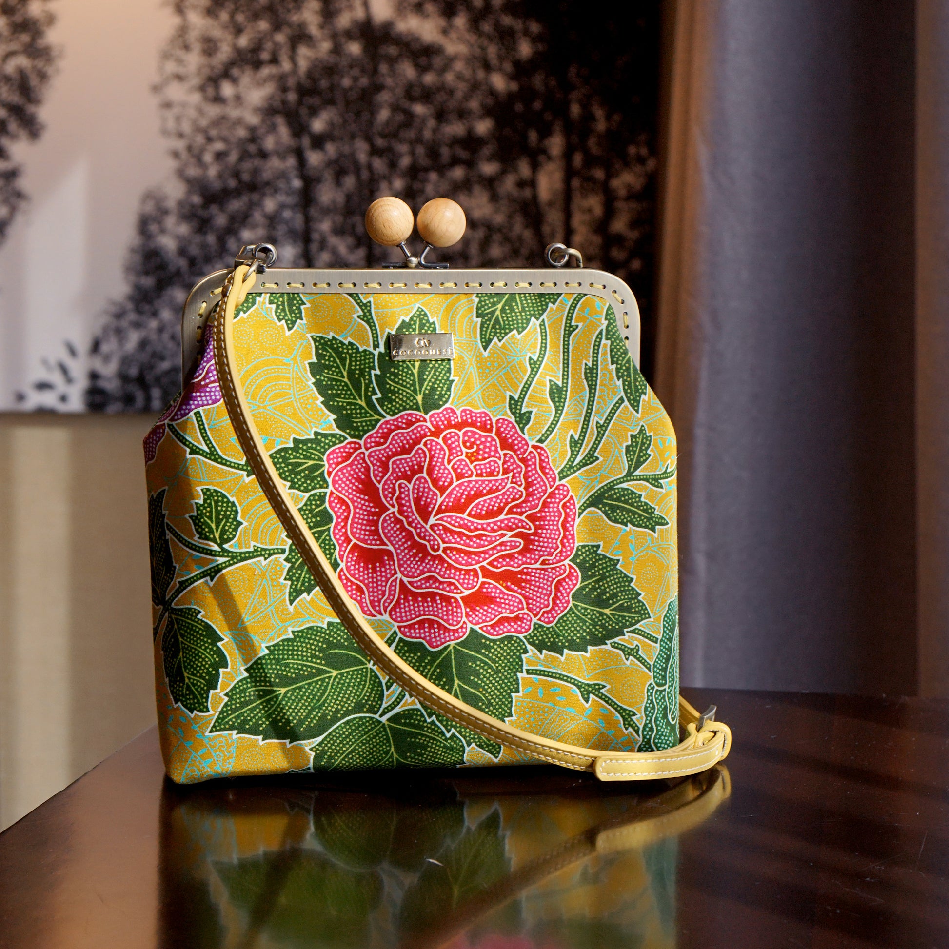 Introducing a medium-sized bag with a chic bronze square frame that perfectly holds your essentials. Its reinforced bottom maintains a stylish shape while supporting heavier items, keeping the bag light. Organize small items in the interior pocket, and use the detachable leather strap or long metal chain for versatile carrying options. The retro-chic wooden ball bag frame adds a touch of vintage flair. |