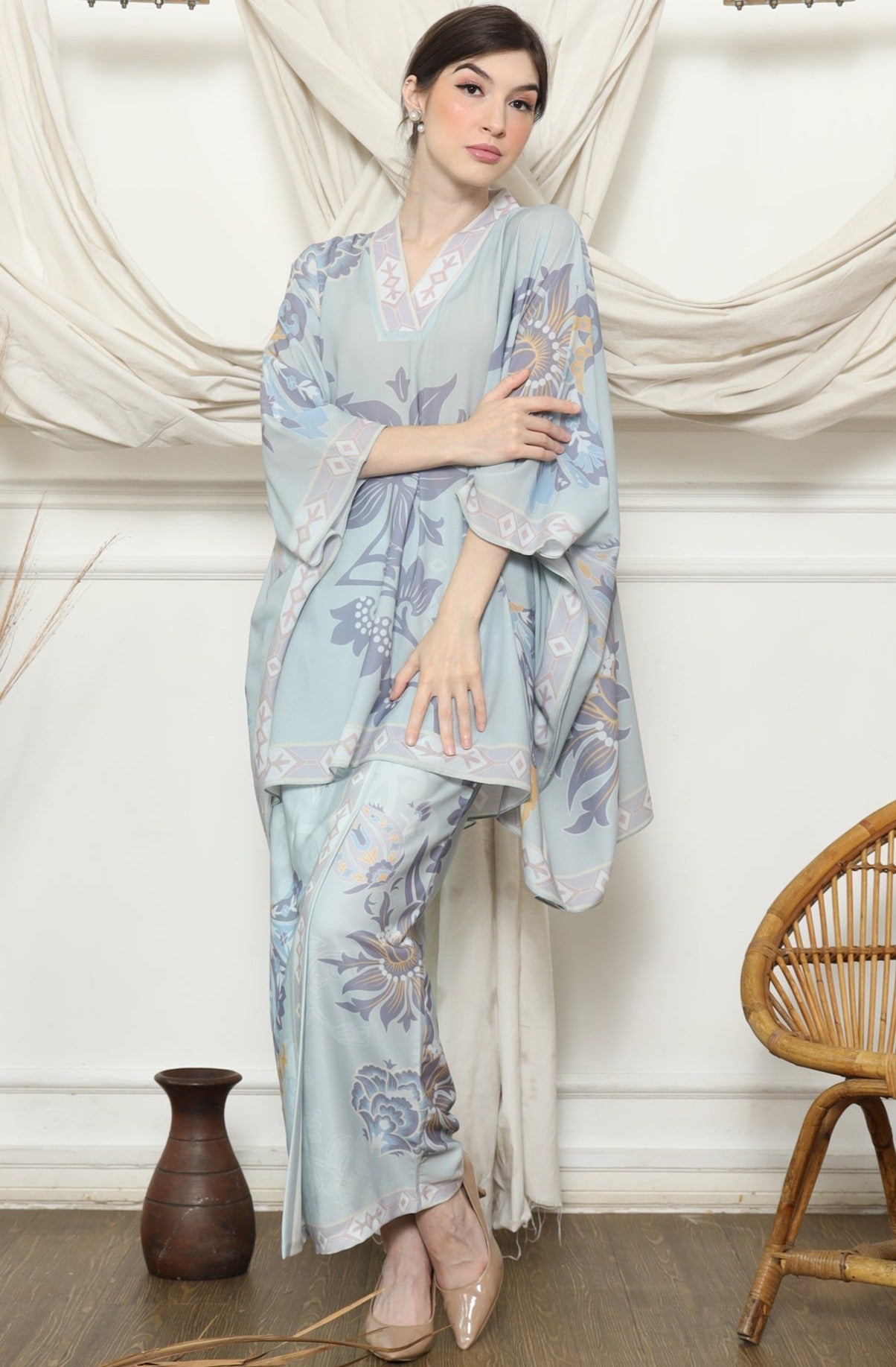 Kanzi Collection modern floral prints was inspired by the numerous modern botanical gardens in South East Asia. The top tunic made from lightweight satin material, which has super comfortable to lounge around in, adjustable drawstring and the round neckline is an added feature that offers a glamorous way to cover up and is perfect for evening wear. We can style this tunic with a skirt or sarong for special events.